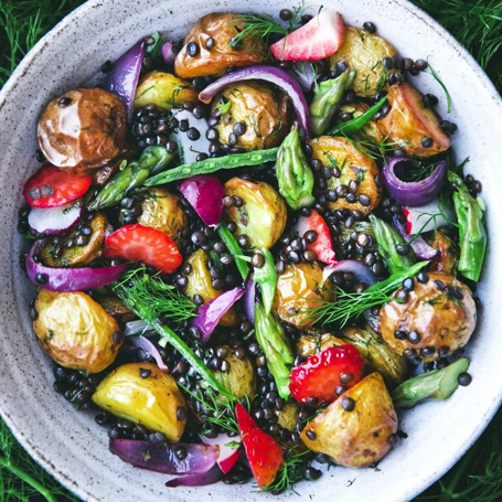 En sallad med rostad potatis och nykokta linser som slungas i en dillvinägrett, det går inte av för hackor det. Om den dessutom toppas med sparris, peppriga rädisor och söta jordgubbar är det garanterad succé. Salladen fungerar lika bra på middagsbordet som på picknickfilten.