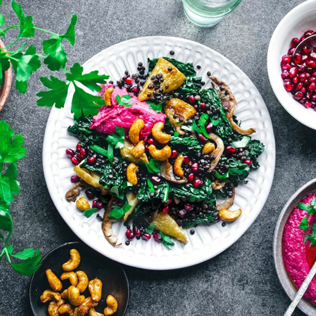 En härlig höstsallad packad med smak, färg och textur med belugalinser för extra mättnadskänsla och en vacker rödbetshummus för krämighet.