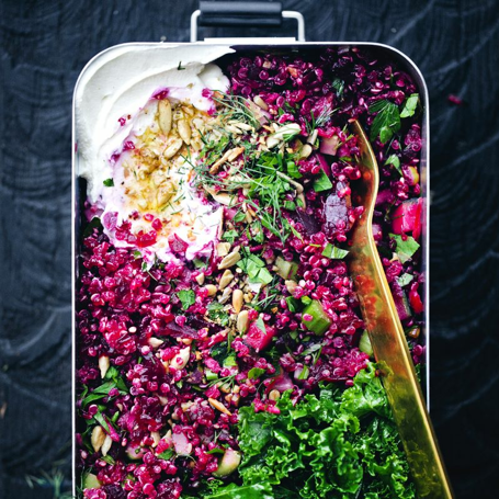 Den här fantastiskt vackra och goda rosa quinoasalladen går enkelt att göra genom att röra ihop kokt quinoa med rödbeta, rivet äpple och örter. God som en middagssallad eller som fyllning i wraps. Och resterna blir perfekta i en matlåda.