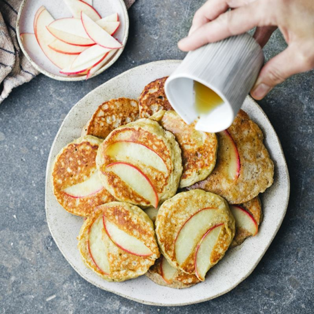 De här äppelpannkakorna är en sundare glutenfri variant av tjocka amerikanska bananpannkakor, med äppelmos istället för banan. Snabba frukostpannkakor som smakar ljuvligt på hösten.